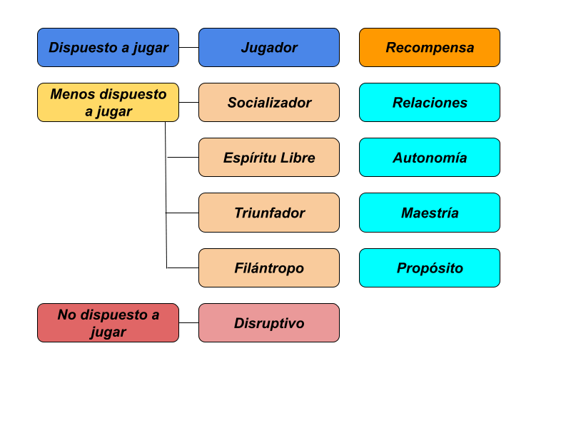 - Disruptores: Se encuentran motivados por el cambio, se sienten forzados a participar, por lo que quieren perturbar el sistema de juego, ya sea directamente o a través de otros para forzar un cambio, sea positivo o negativo.