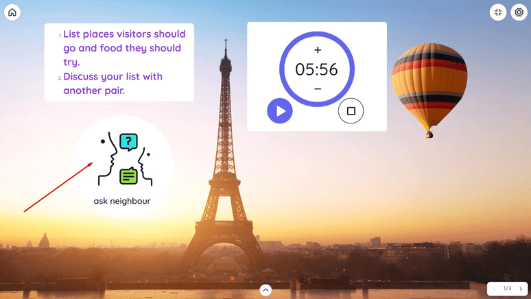 Segundo, es necesario crear acuerdos lingüísticos sobre el uso del inglés, entre pares y con los profesores. A diferencia de los cursos que utilizan la lengua materna, las clases de inglés comportan el aprendizaje de un código lingüístico diferente, además del tema que ocupe la clase. Por ello, cuando los estudiantes trabajan juntos, en ocasiones los escuchamos utilizar expresiones en español para preguntarse cómo se dice y qué significa alguna palabra. Antes de decir “In English, please!”, convengamos en que hay expresiones con propósito comunicativo (diferentes al classroom language), que deben usar en el desarrollo del trabajo de ese día, las mismas que darán pie a las preguntas o conversaciones dentro del aula. Usando Classroomscreen, podemos colocar estos prompts en un lugar visible para todos desde cualquier lugar del salón, sin necesidad de utilizar el libro o estar revisando el cuaderno y enfocarse eficientemente en la actividad.
