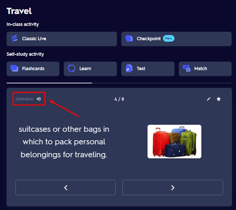 Una herramienta útil en este aspecto es Quizlet: una aplicación que ayuda a crear tarjetas con contenido educativo. En este caso, permite crear ficheros con palabras de vocabulario por temas, nos sugiere varias definiciones desde un diccionario y no de traductor online (punto a favor) e imágenes asociadas a este término.